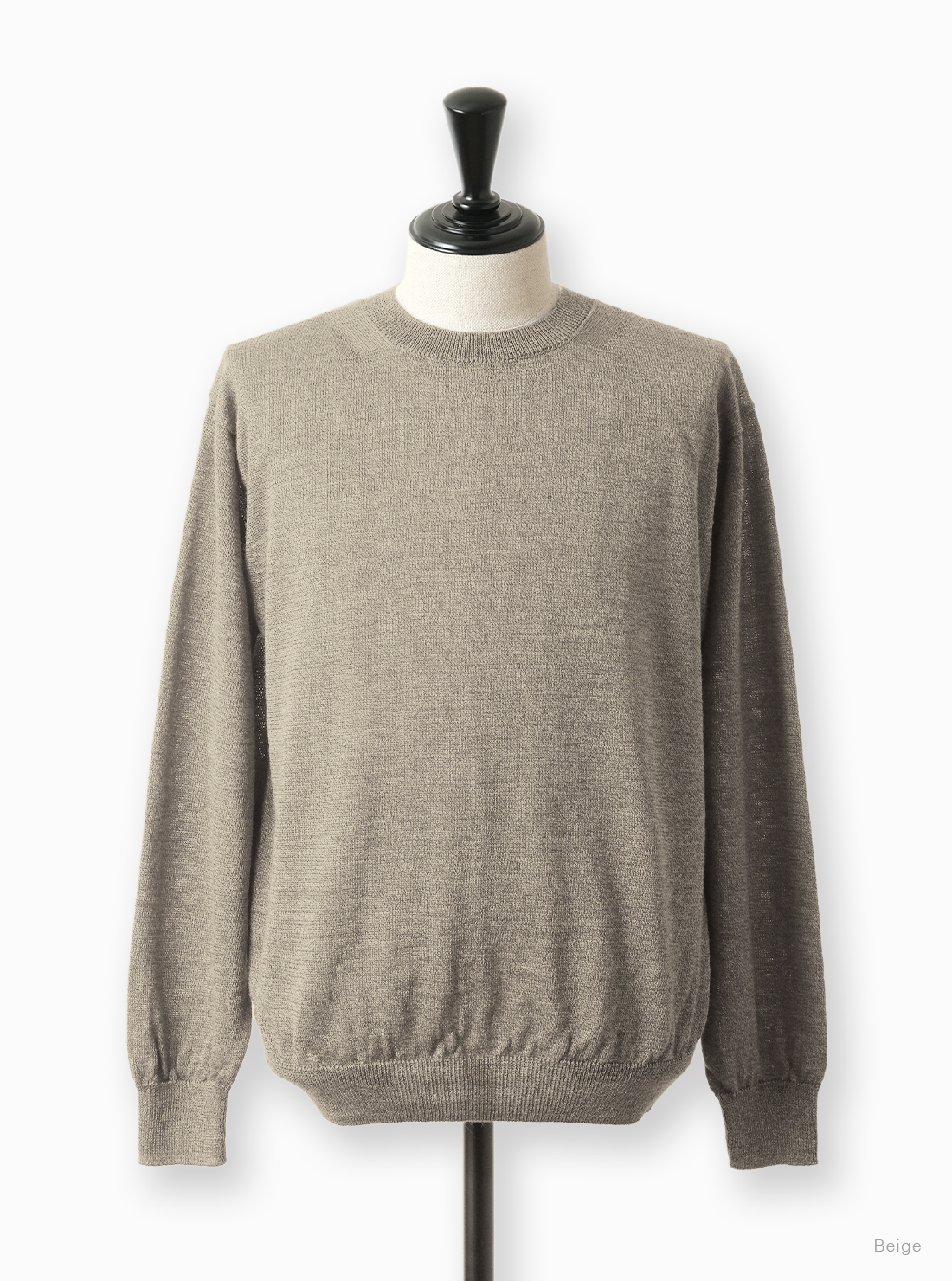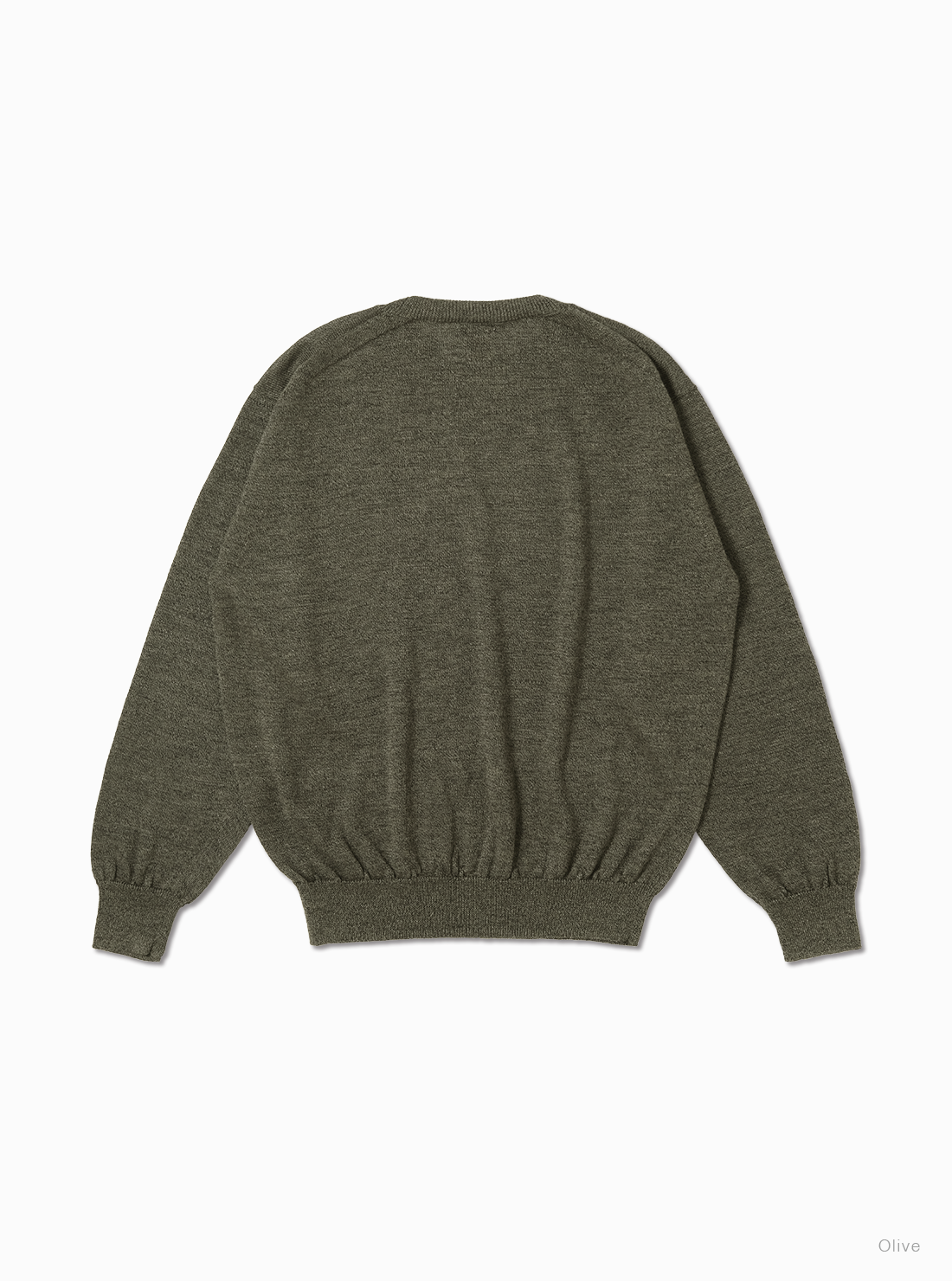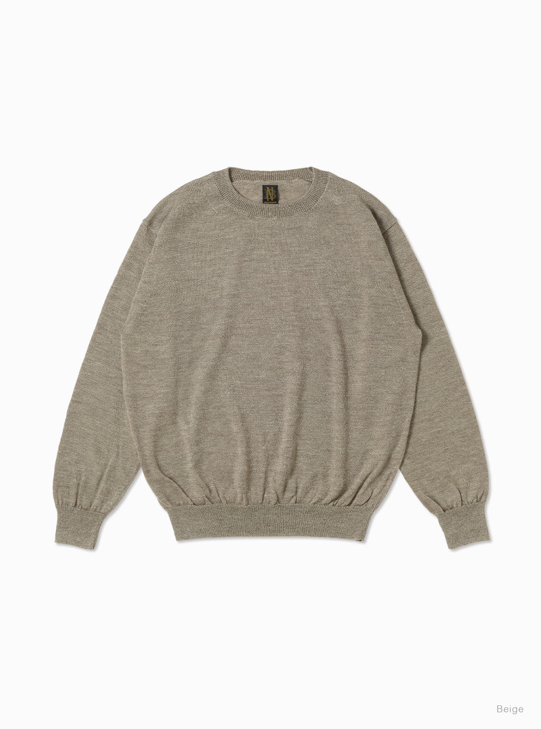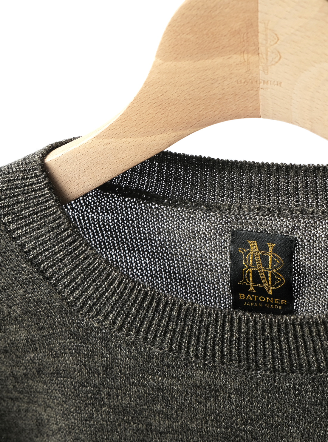 細番手のラミーと細番手のウールの梳毛を撚糸した糸を、あえてゆるく編んだ透け感のある商品。ラミーを採用することによりハリコシを保ちながら、さりげないシアー感とラミーならではのざっくりした表情・清涼感のある商品。