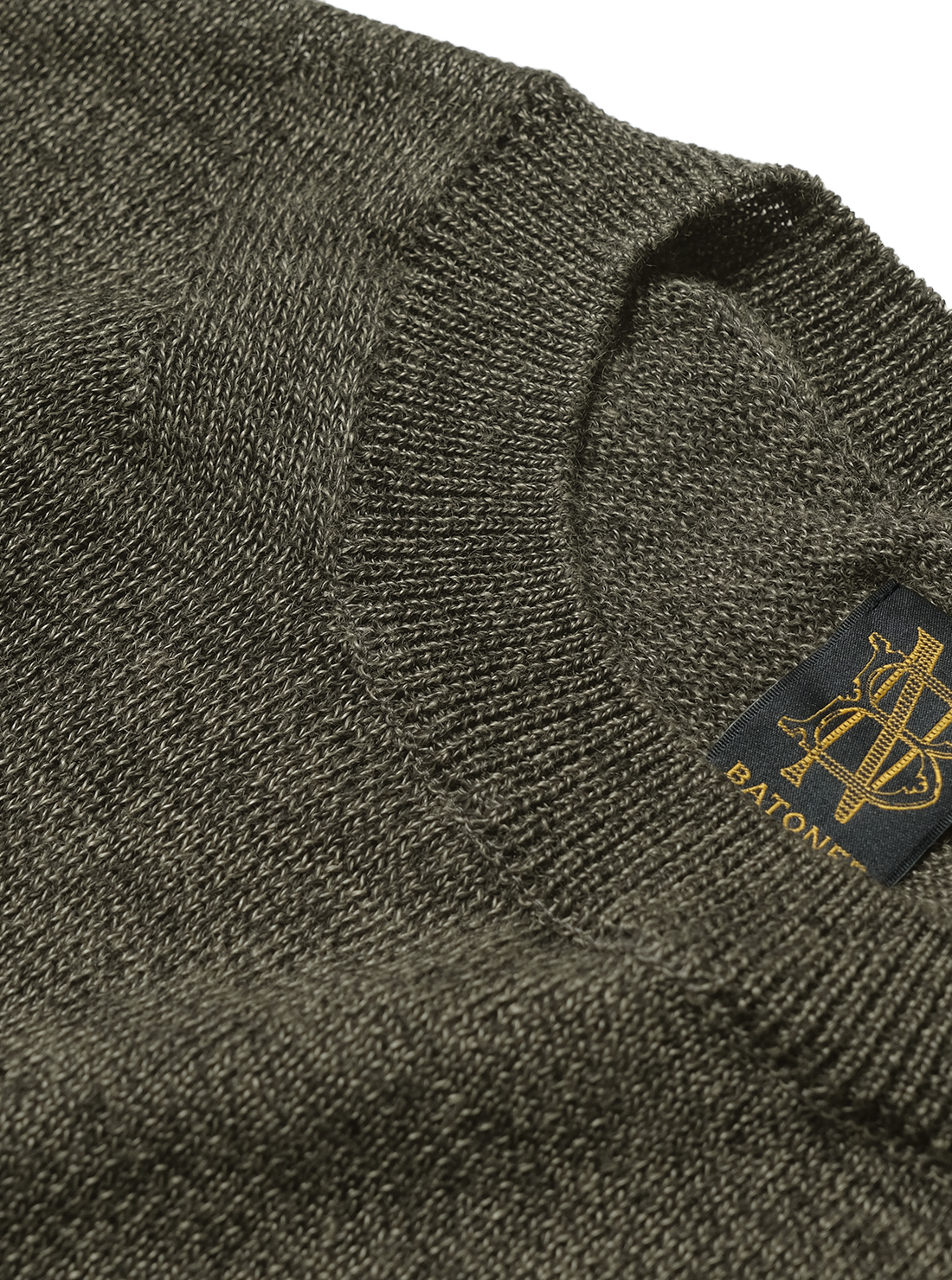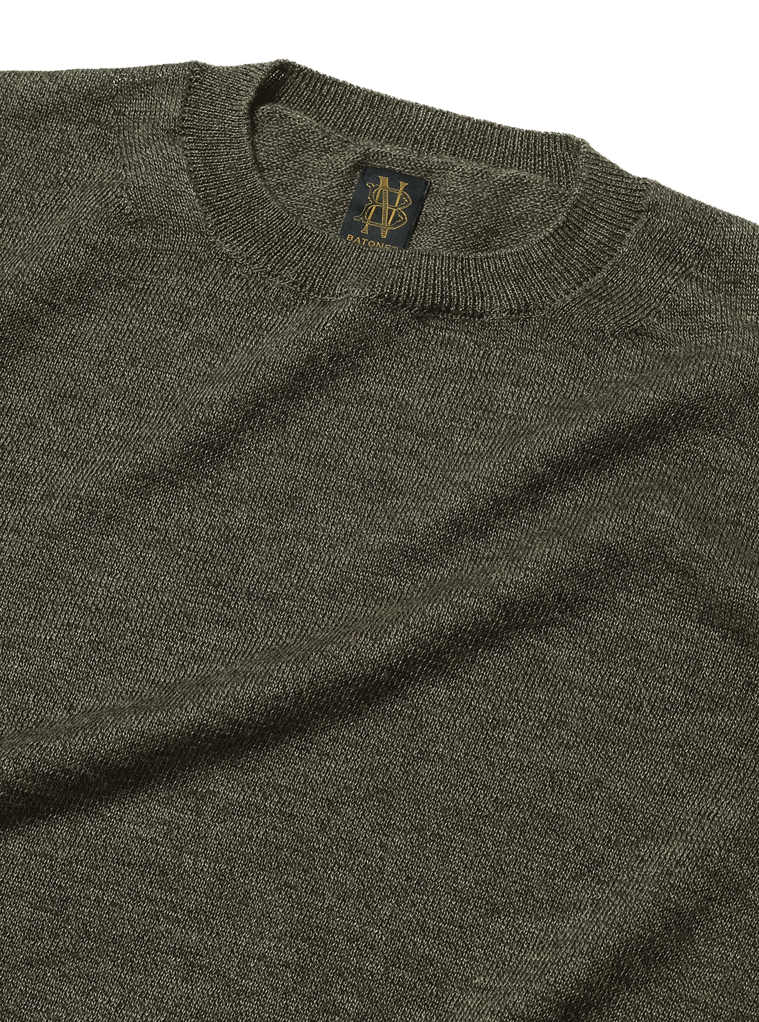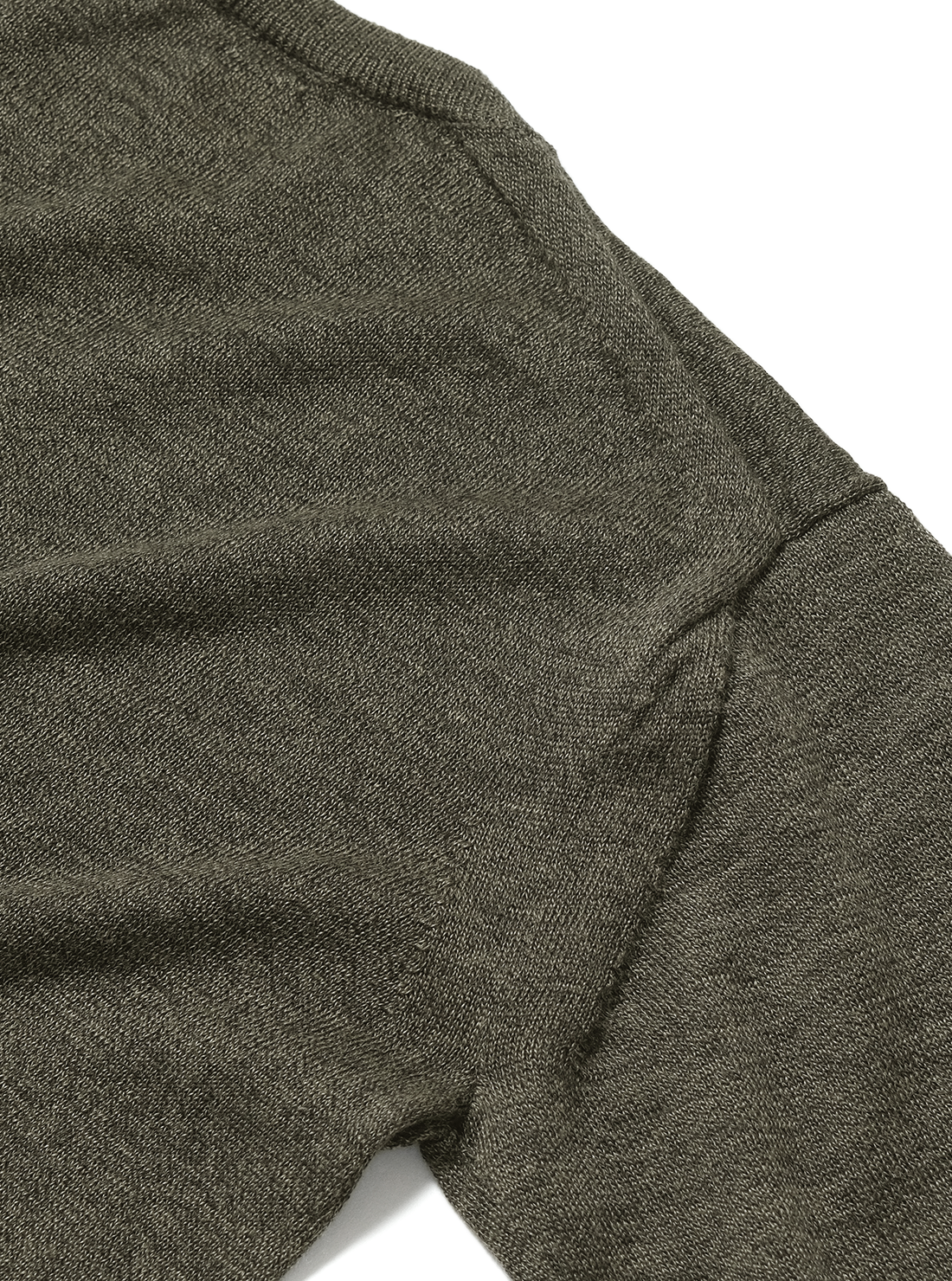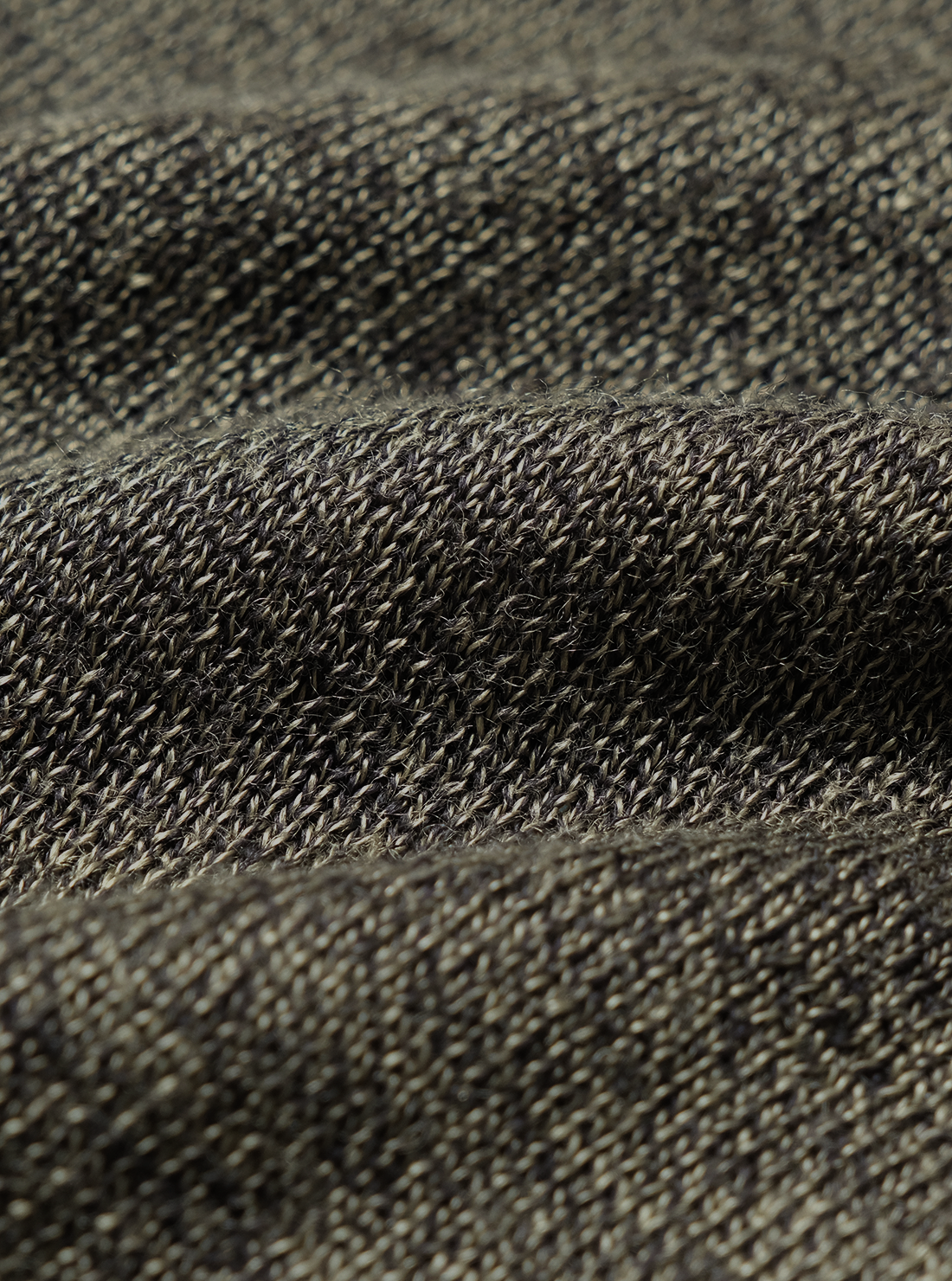 細番手のラミーと細番手のウールの梳毛を撚糸した糸を、あえてゆるく編んだ透け感のある商品。ラミーを採用することによりハリコシを保ちながら、さりげないシアー感とラミーならではのざっくりした表情・清涼感のある商品。