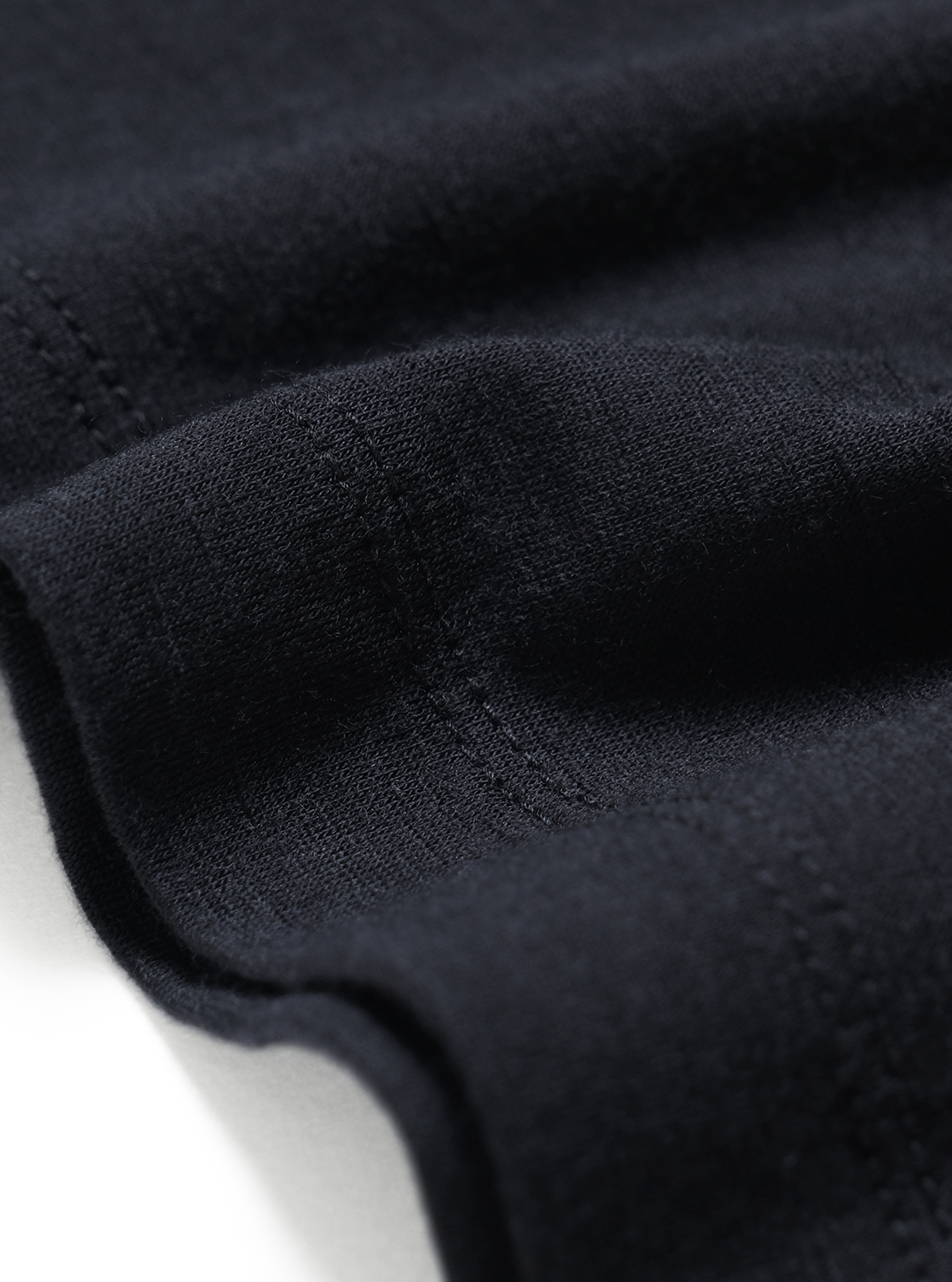 梳毛ウールの特性を活かし、肌触り・風合い・ドレープ性にこだわったウール100%の生地を使用。細くて長い繊維を使用しており、肌触りはとても柔らかく滑らかな商品。袖口はリブ付きで、肩幅・身幅にゆとりのあるデザイン。