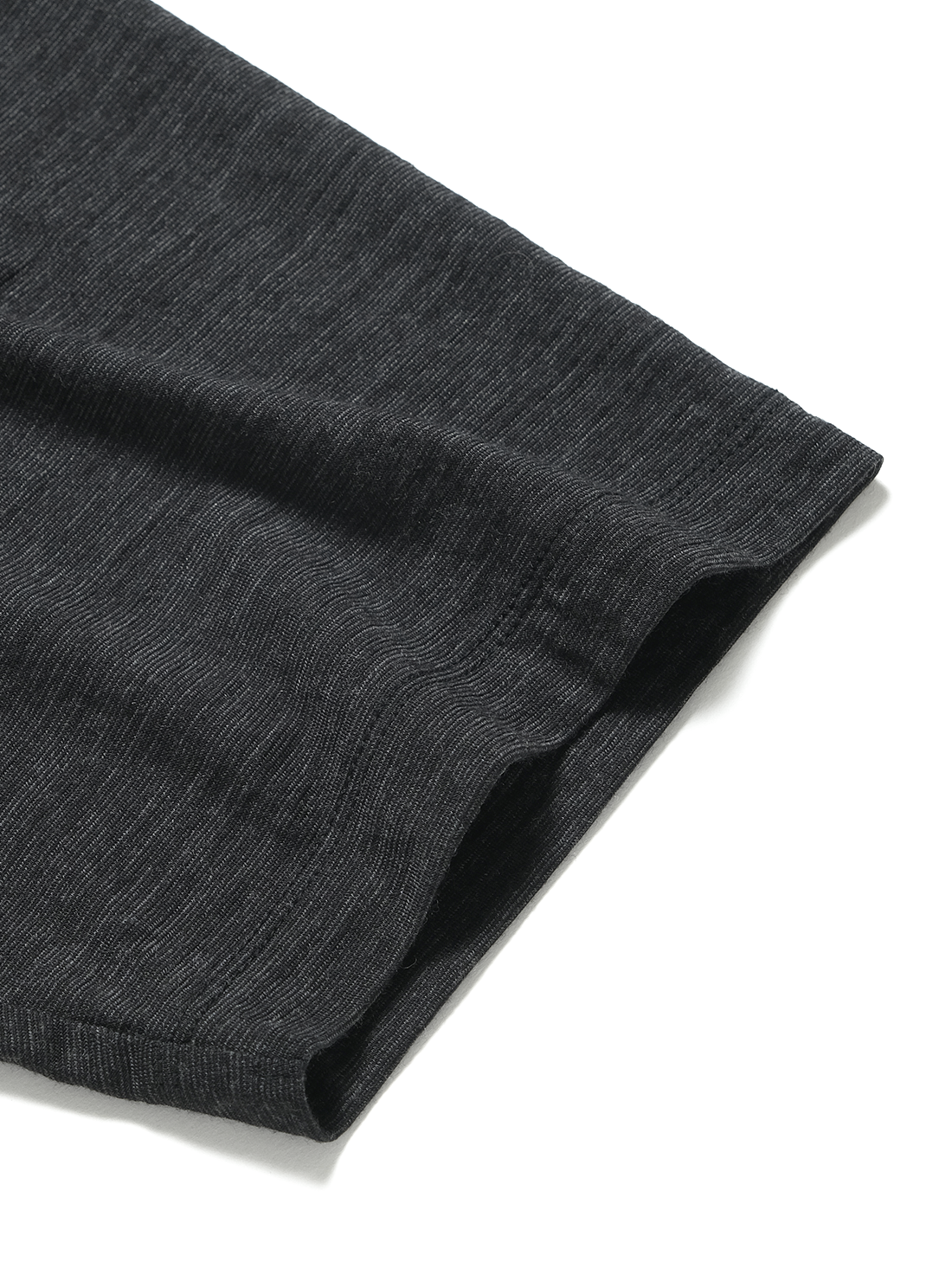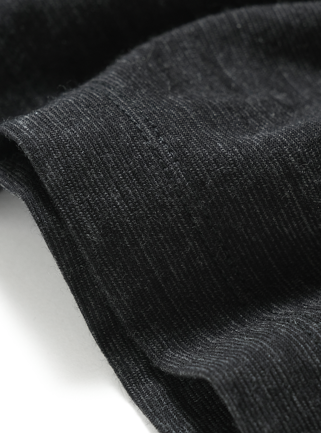 梳毛ウールの特性を活かし、肌触り・風合い・ドレープ性にこだわったウール100%の生地を使用。細くて長い繊維を使用しており、肌触りはとても柔らかく滑らかな商品。ロングスリーブよりややシャープなラインになっており、襟元はタコバインダー仕様。