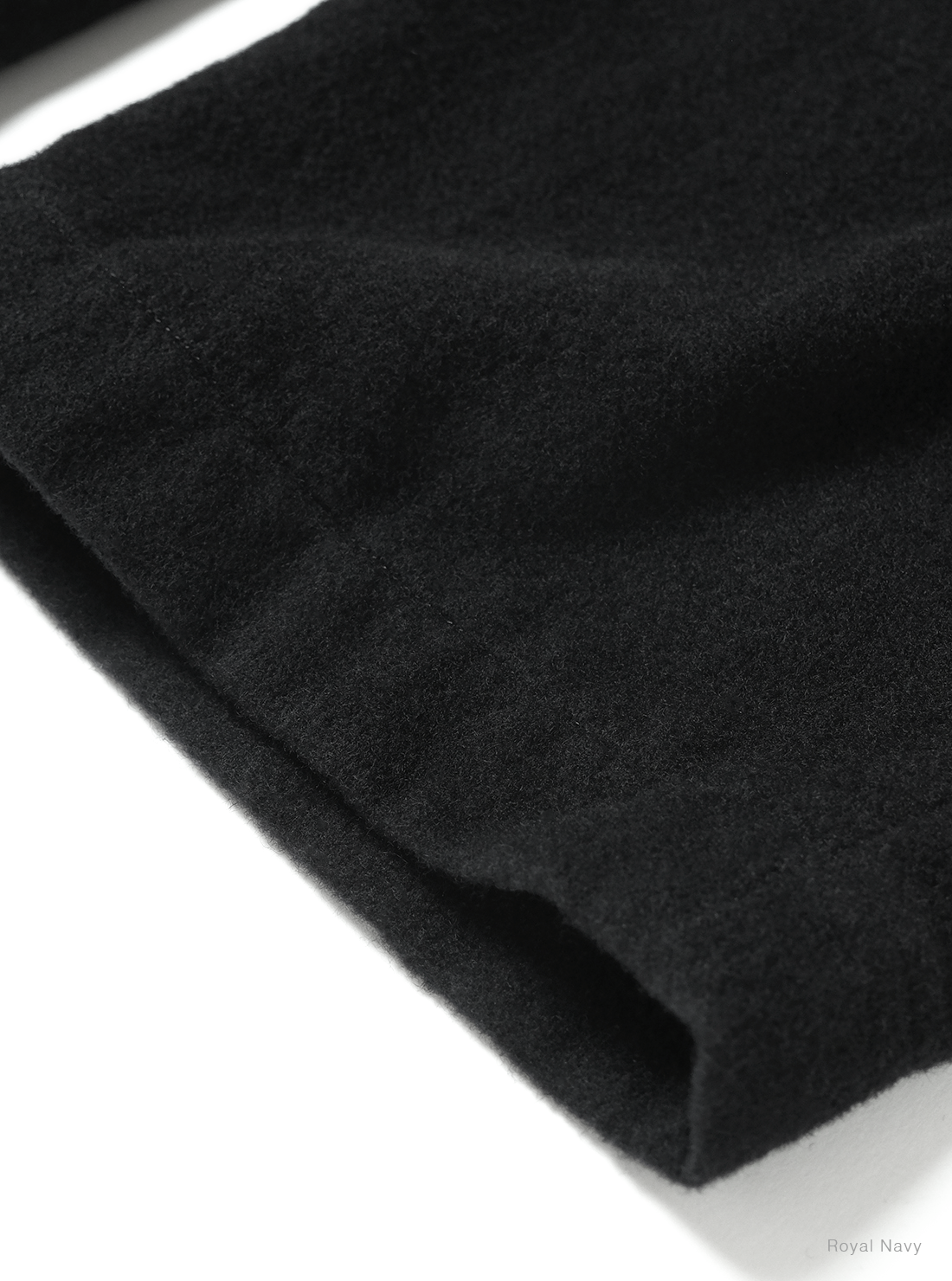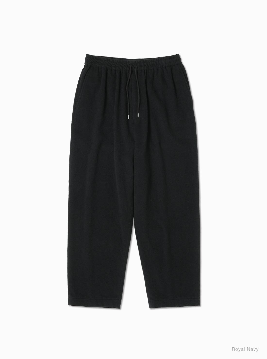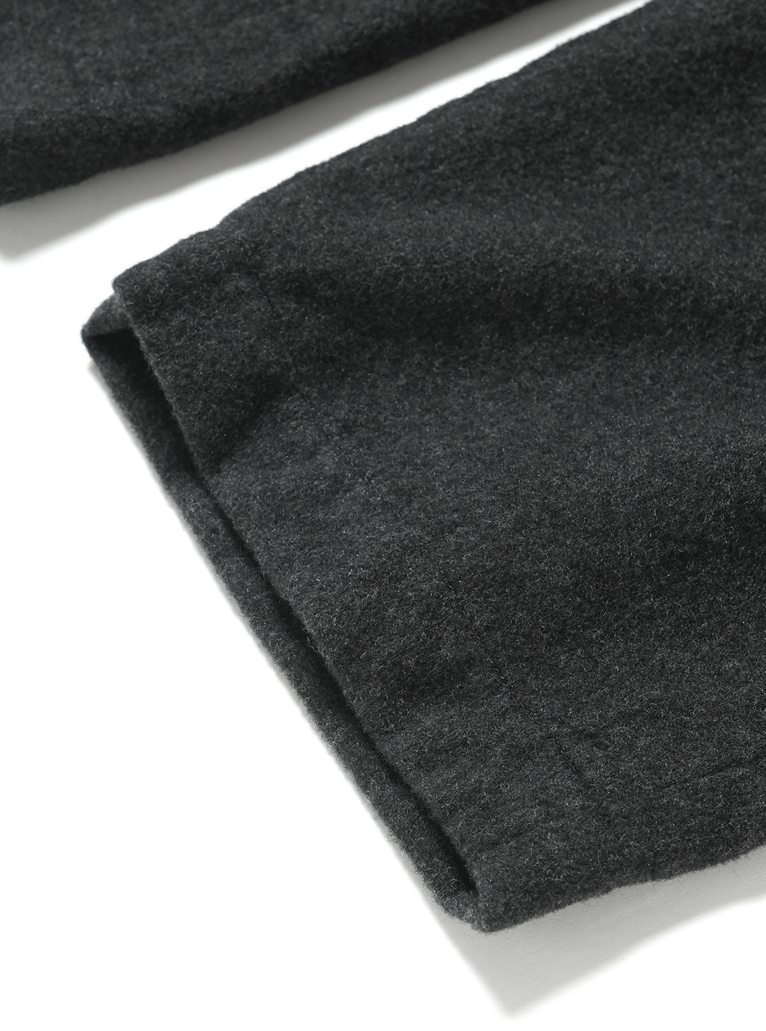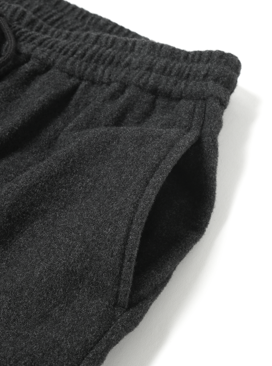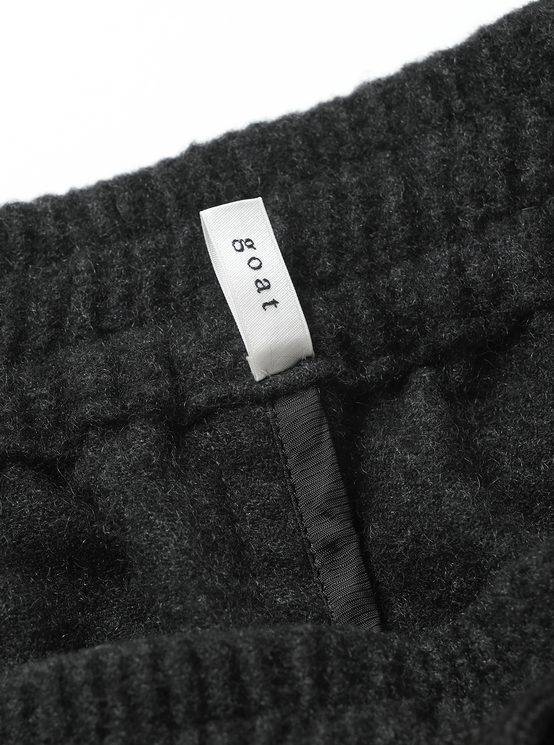 ニット用に紡績された紡毛カシミヤに甘撚りをかけて生地に仕立て、さらにニット用の縮絨加工を施すことで、布帛でありながらニットのような柔らかさと膨らみを実現。ウエストはゴム仕様で、紐による調節も可能。