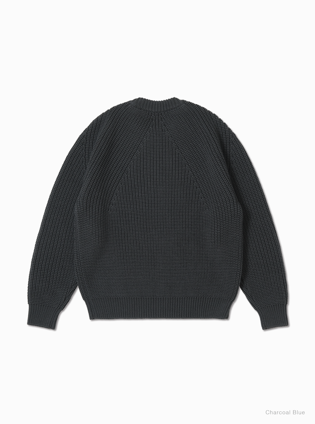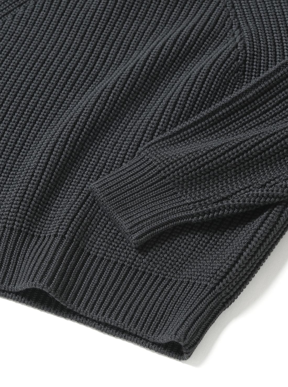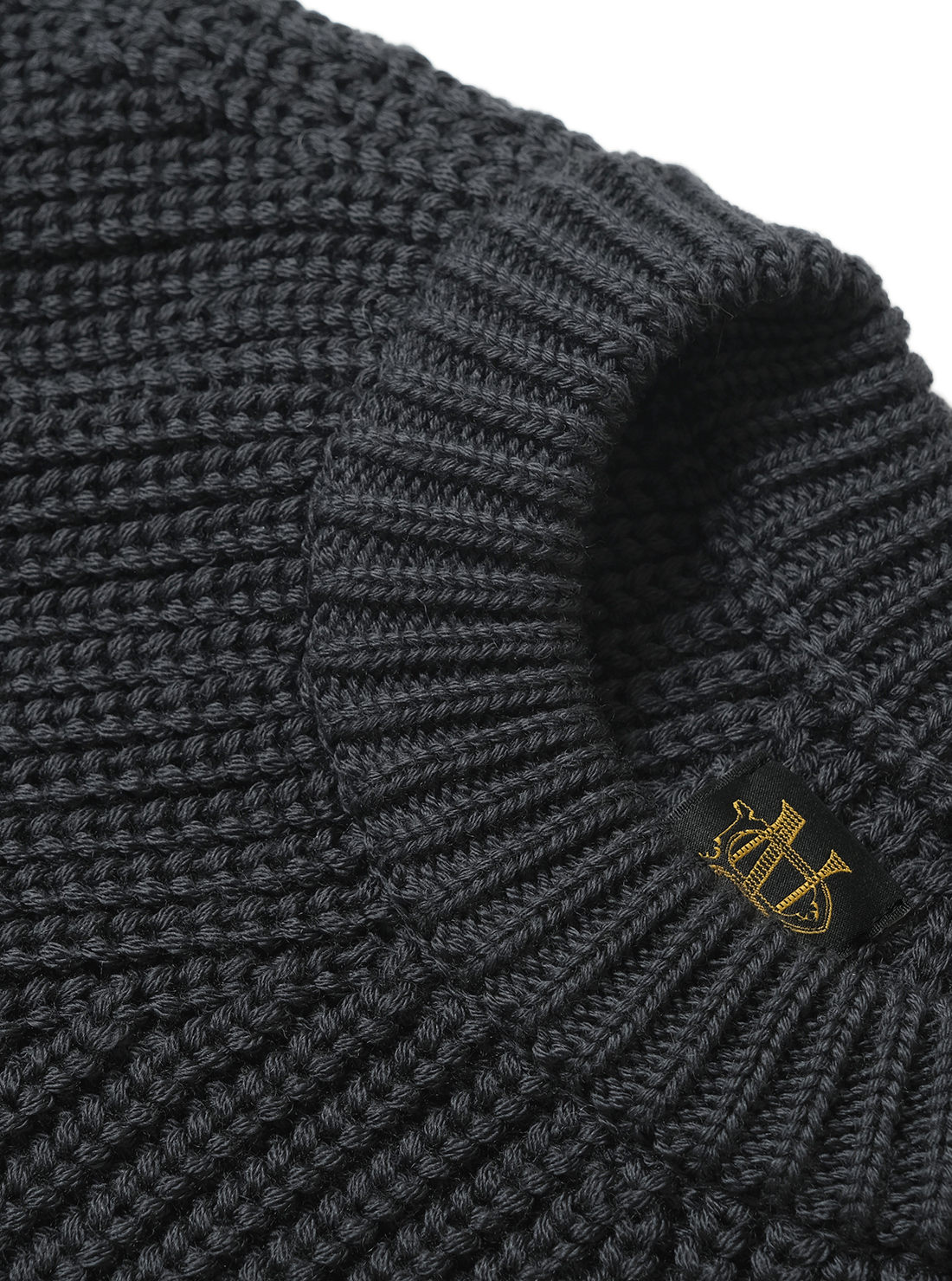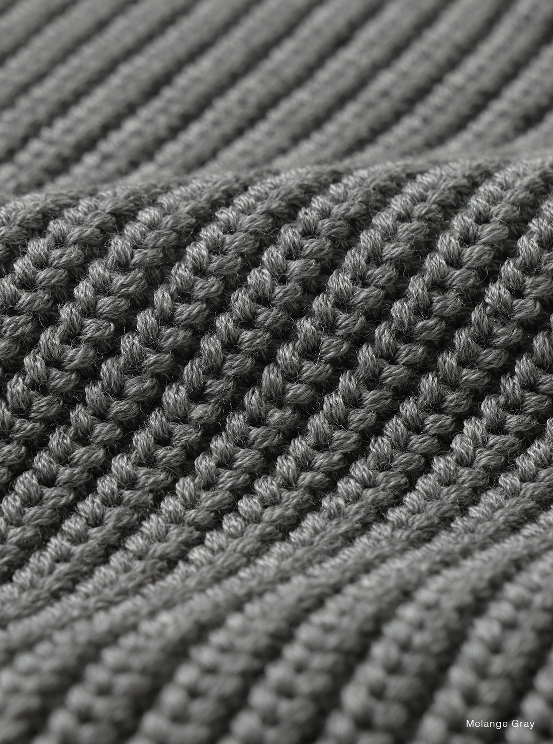 SIGNATUREシリーズの為に開発したSOLIDWOOLという糸を使用。ダレにくく、毛玉になりにくい商品で編み目の立体感が特徴。BATONERらしい象徴的な編み柄が際立つ商品。
