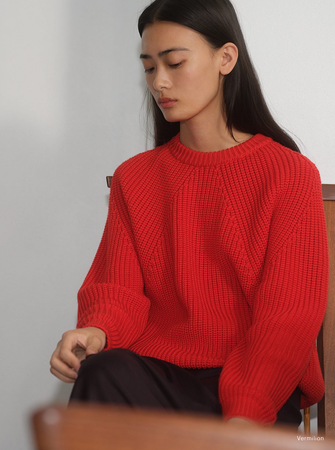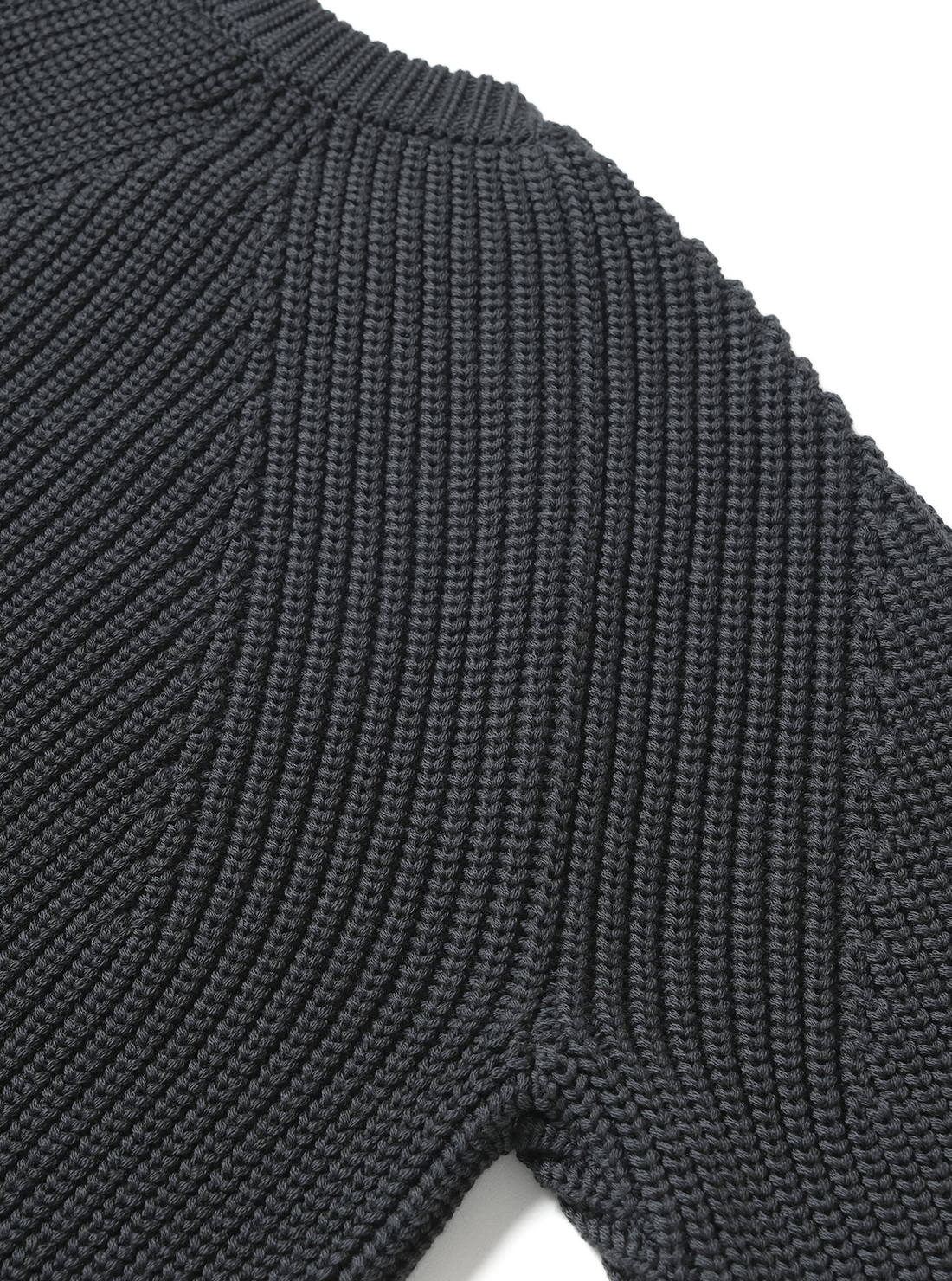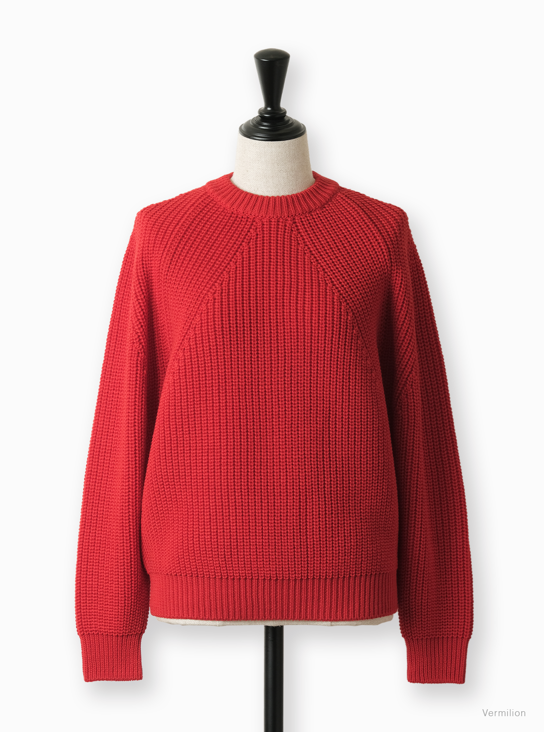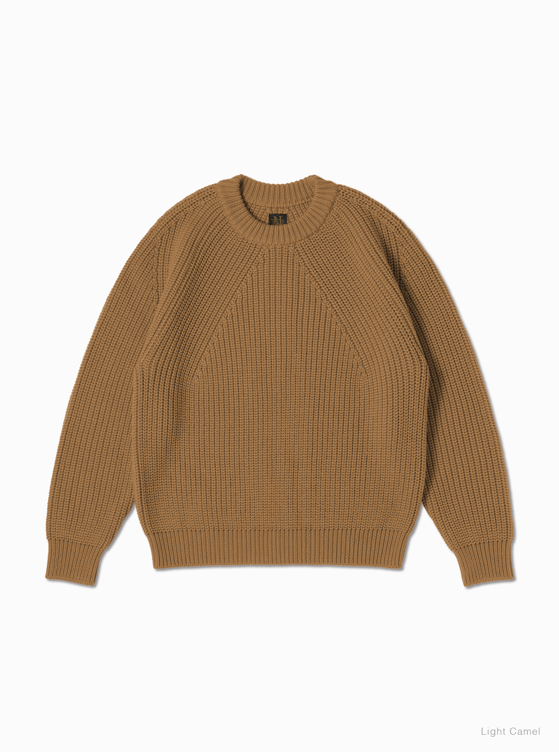 SIGNATUREシリーズの為に開発したSOLIDWOOLという糸を使用。ダレにくく、毛玉になりにくい商品で編み目の立体感が特徴。BATONERらしい象徴的な編み柄が際立つ商品。