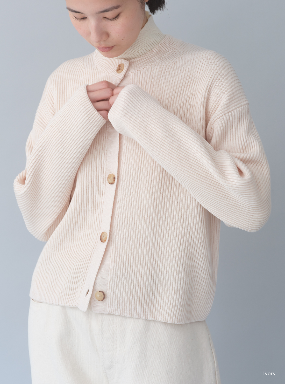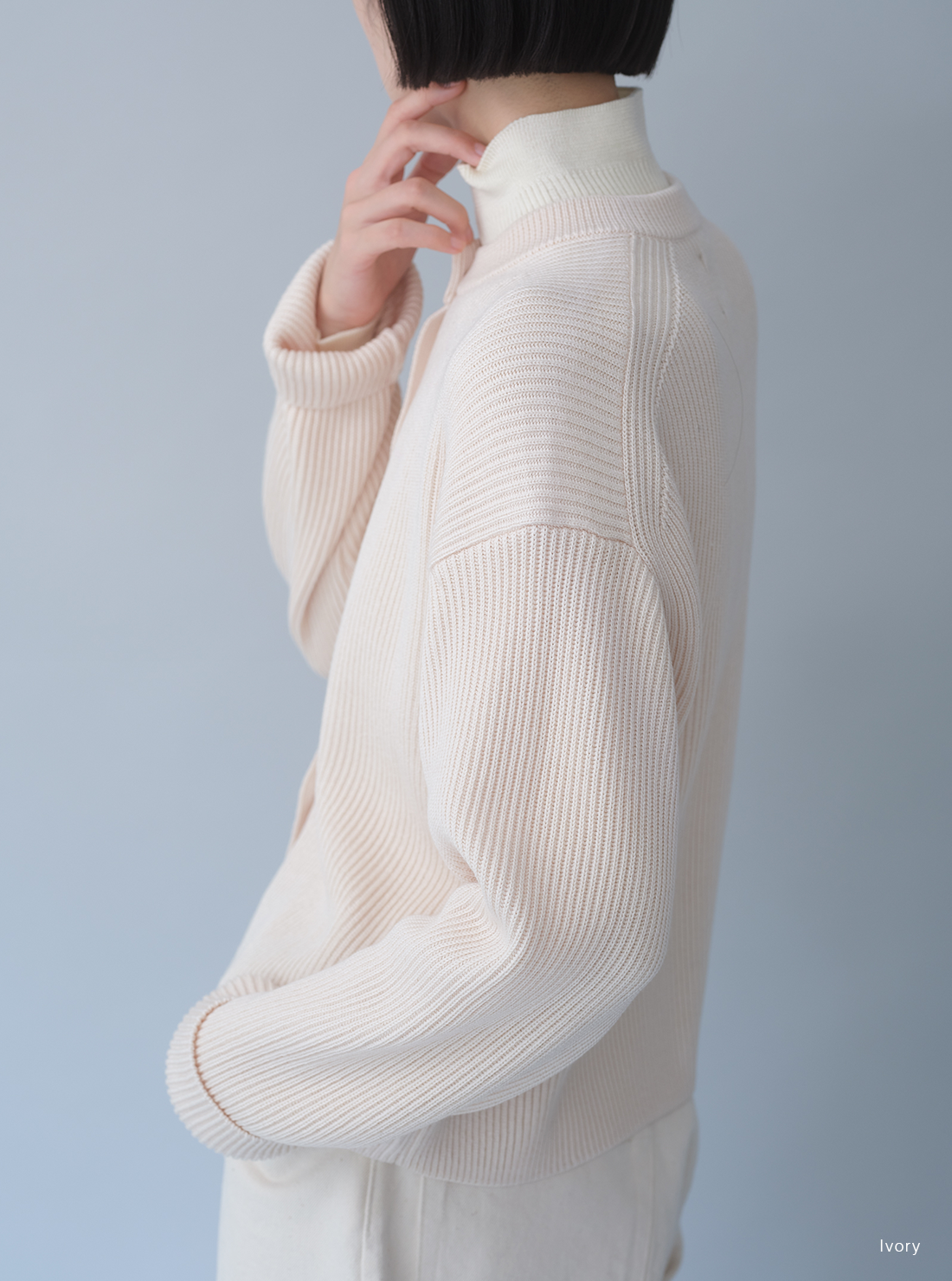 SIGNATUREシリーズの為に開発したSOLIDWOOLという糸を使用。ダレにくく、毛玉になりにくい商品で編み目の立体感が特徴。余計な膨らみを抑えて、すっきりとしたラインが際立つ商品。肩幅・身幅にゆとりがあり、袖丈はやや長め。