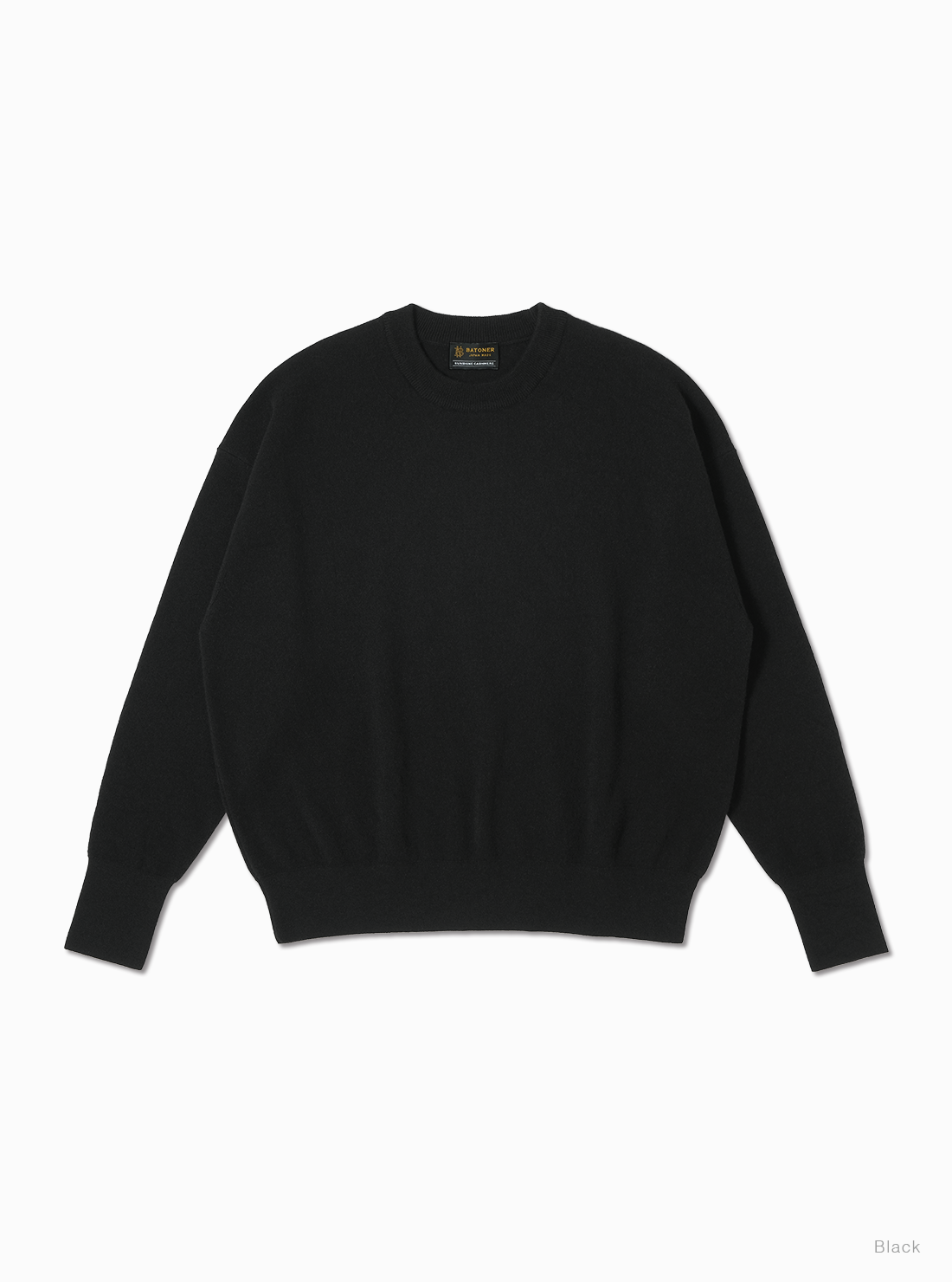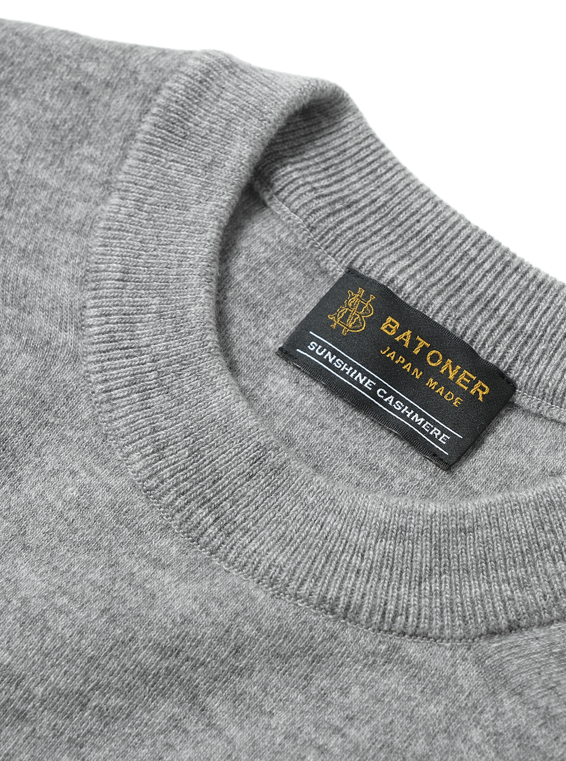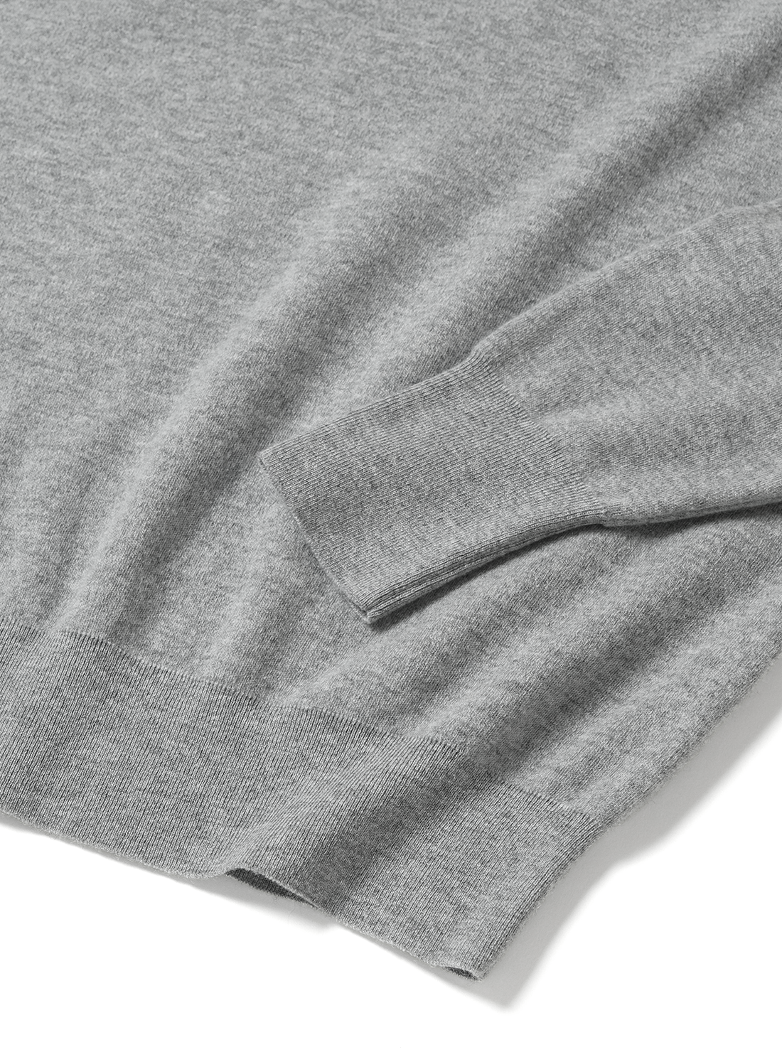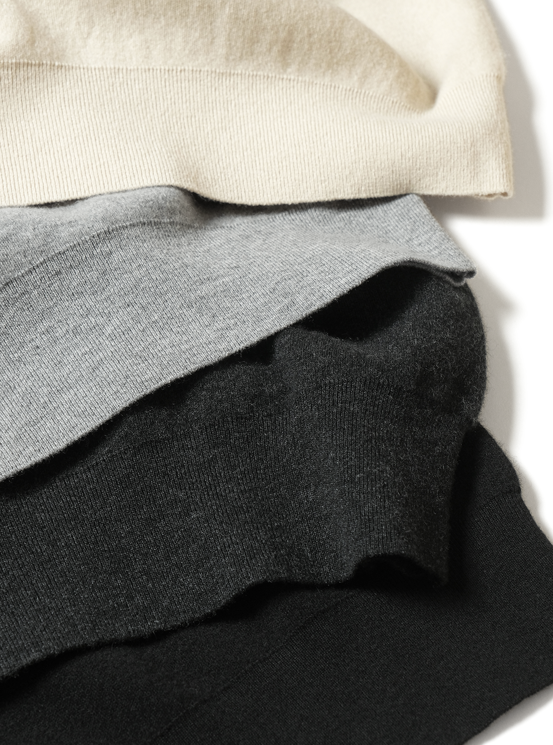 内モンゴル最東端に生息する希少なカシミヤヤギの繊維を使用。長時間の日照と肥沃な土地で育ったヤギから得られる、極細ながら強度のある原料。独自開発の極細番手カシミヤ糸を採用し、柔らかさだけでなく、ハリ・コシを備えたこれまでにないタッチを実現。極細糸を密に編み上げた32ゲージの高密度スムース編みにより、しなやかで弾力のある仕上がり。袖リブはやや長め。