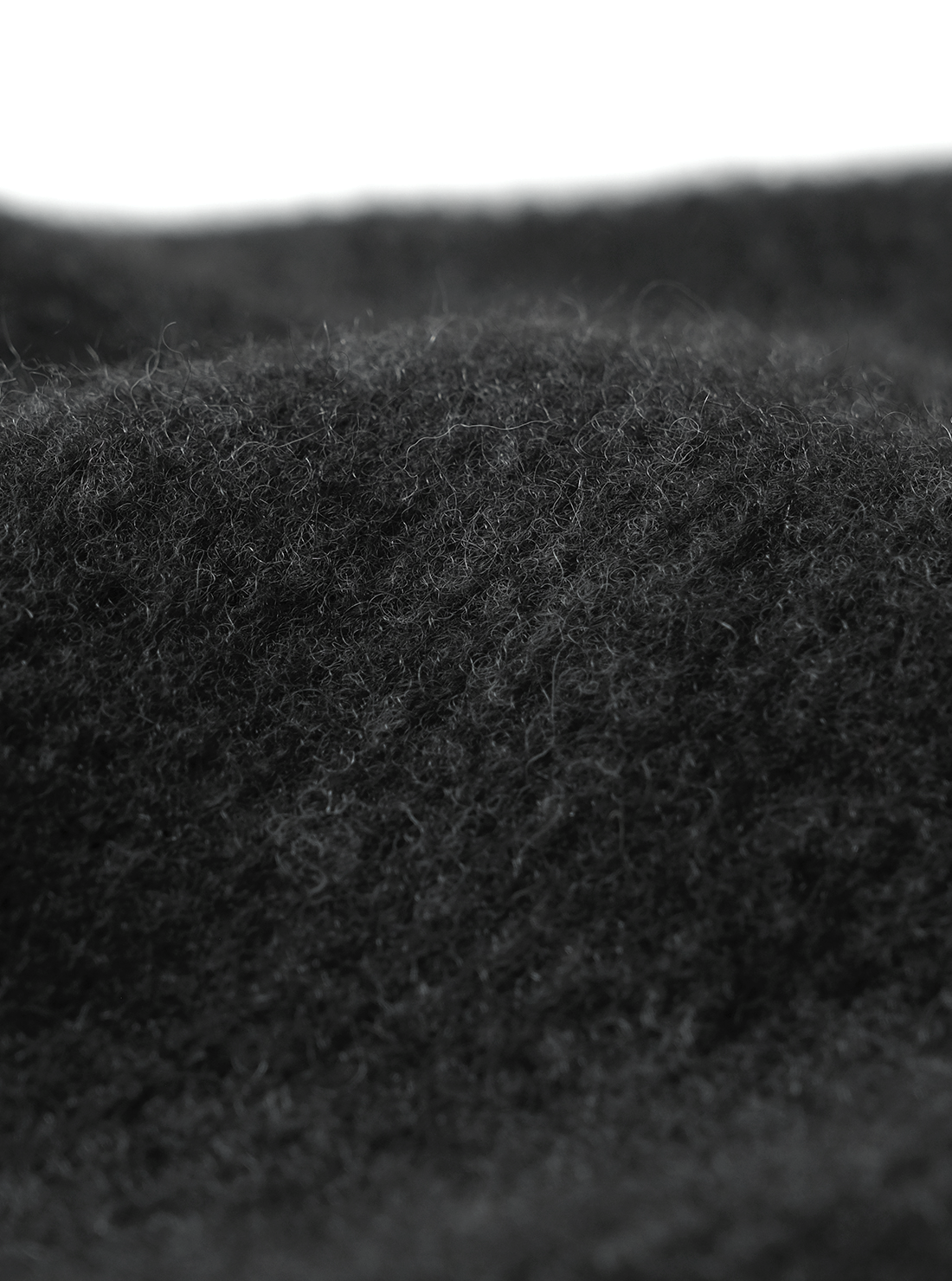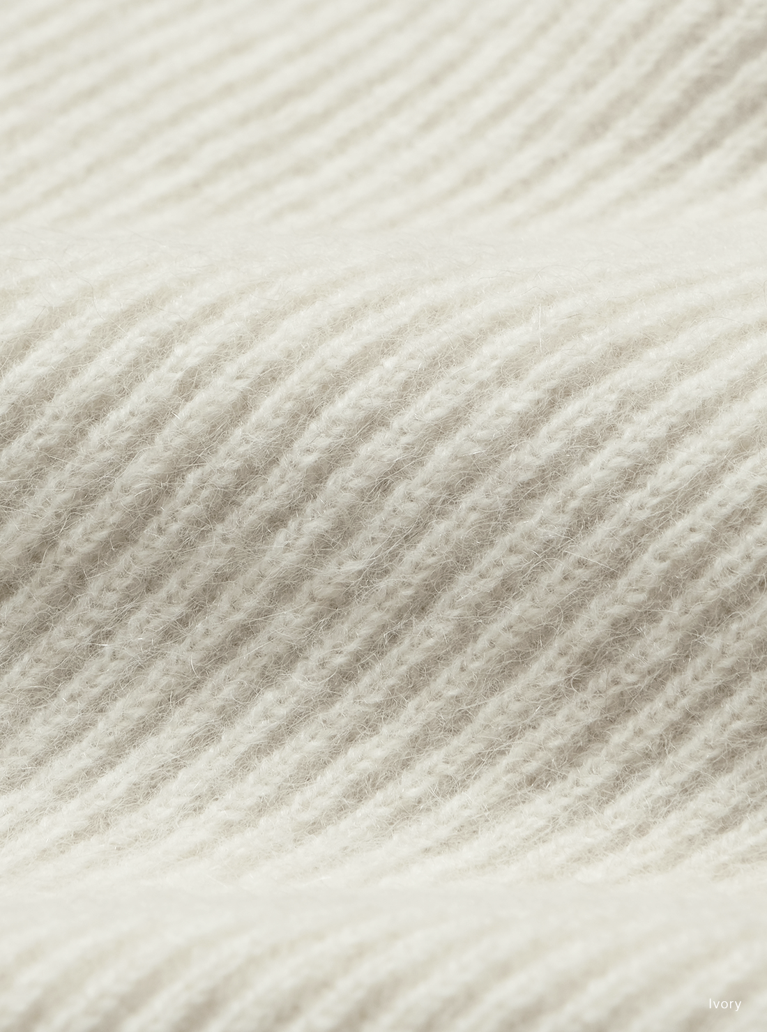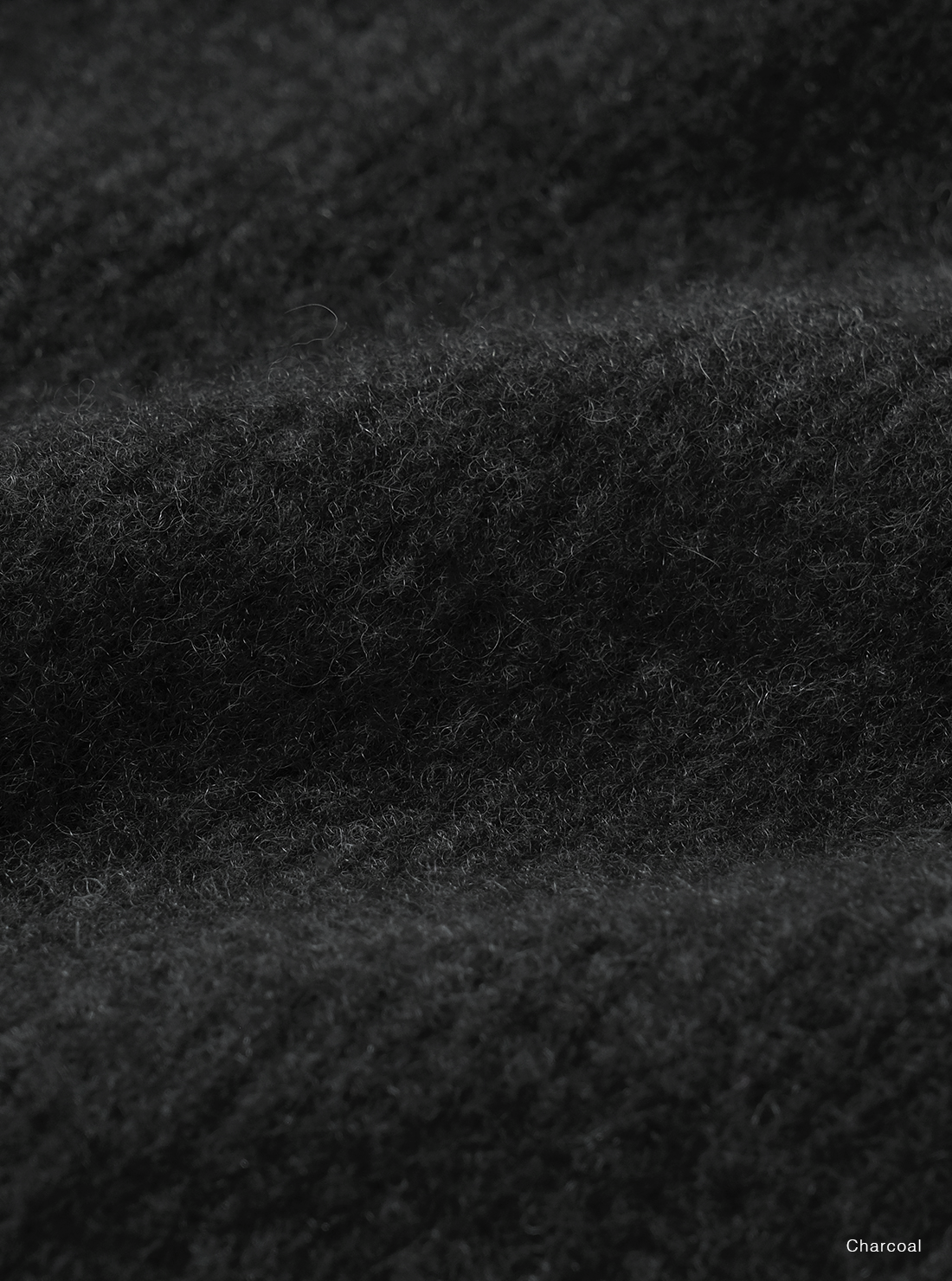 ほんのり青みがかった淡いグレーのブルーフォックスと、カシミヤの主要産地の一つとして知られるアルランシャン産の、ふくらみ豊かなカシミヤを使用。これらを、相互の特徴を最大限に引き出す3:1の黄金比でブレンドし、丁寧に紡績しました。この素材ならではの、上質な起毛感、軽やかさ、そして滑らかな肌触りが特徴の商品。
